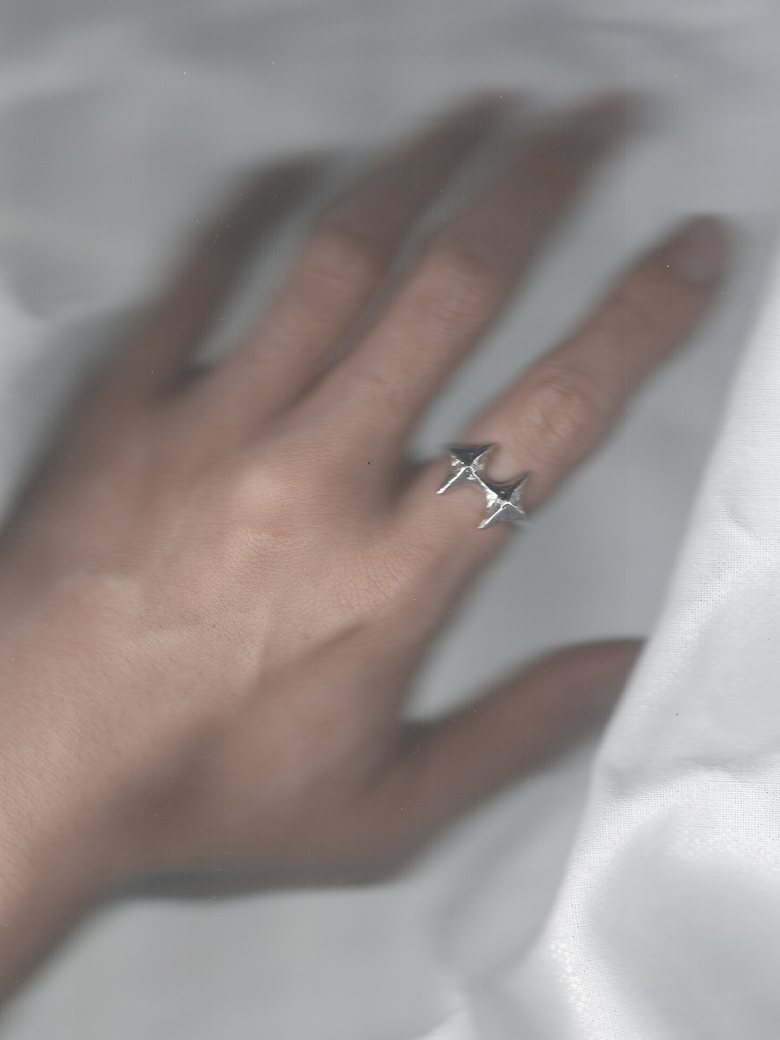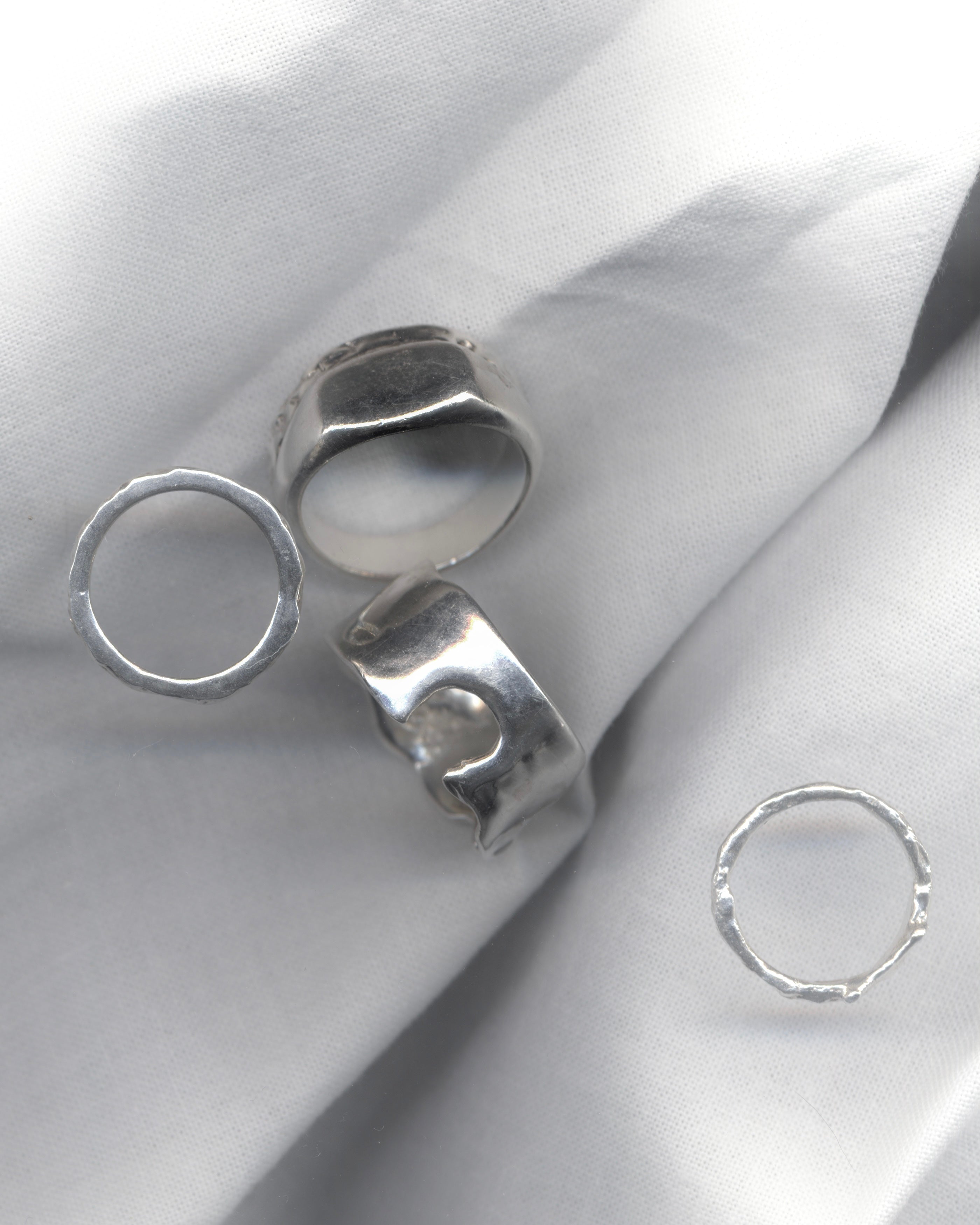 Natural pearls, each with its own light and flaw, meet molten textures to tell a quiet truth—